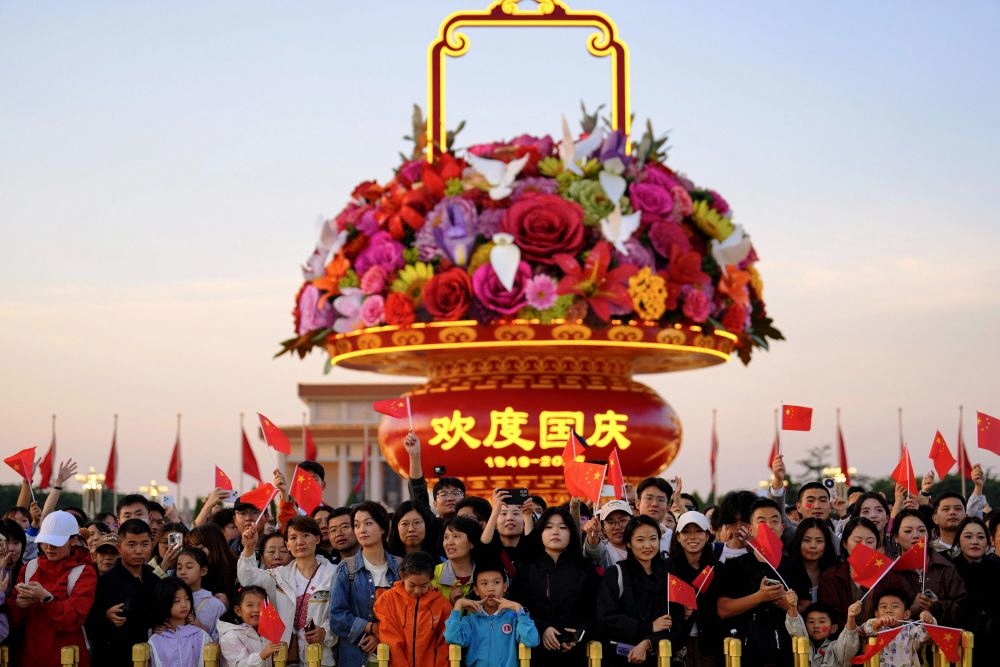 2025年10月1日,在北京天安門廣場,人們觀看升國旗儀式后揮舞國旗。新華社記者邢廣利攝