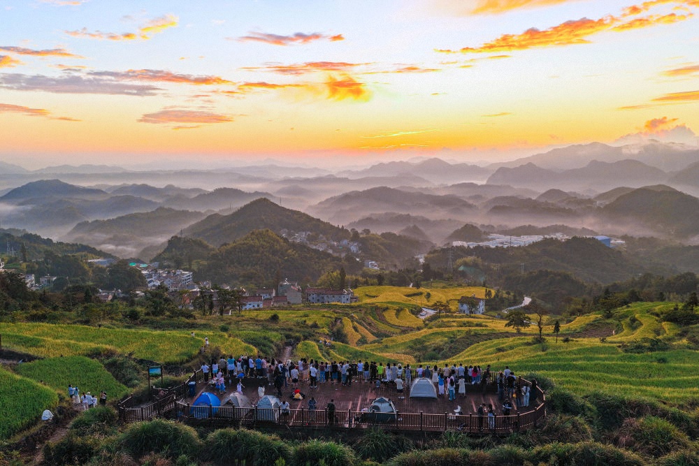 10月4日清晨,游客聚集在浙江省臺(tái)州市天臺(tái)縣泳溪鄉(xiāng)北山村的鎏金梯田觀景臺(tái)拍攝日出(無人機(jī)照片)。新華社發(fā)(林利軍攝)