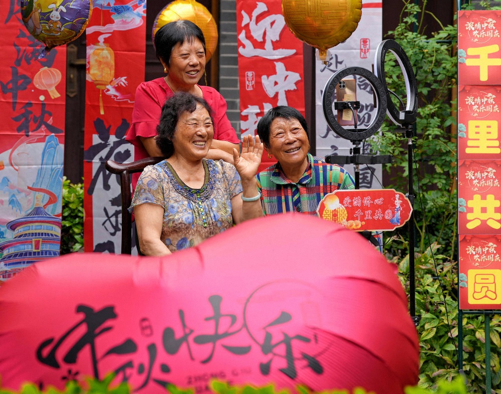 10月6日,在江蘇省海安市墩頭鎮(zhèn)寶祥村“情滿中秋愛暖僑心”活動(dòng)中,僑眷們與海外親人視頻連線。新華社發(fā)(周強(qiáng)攝)