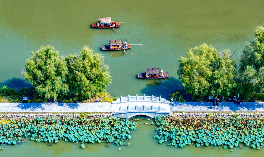 10月7日,游客在江蘇興化里下河國家濕地公園乘船游玩(無人機(jī)照片)。新華社發(fā)(周社根攝)