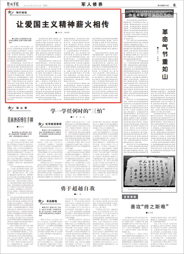 時代各有不同,精神一脈相承。進入新時代,這種“天下興亡,匹夫有責”的愛國主義精神,依然是我們克服一切艱難險阻的強大精神動力。身處偉大時代,肩負強軍重任,新時代革命軍人應當將愛國主義精神淬煉為絕對忠誠的信仰、能打勝仗的本領、作風優(yōu)良的品格,在銘記歷史、緬懷英烈中汲取力量,在現(xiàn)實熔爐中錘煉擔當,讓愛國主義的旗幟在靈魂深處高高飄揚,在強軍實踐中熠熠生輝。