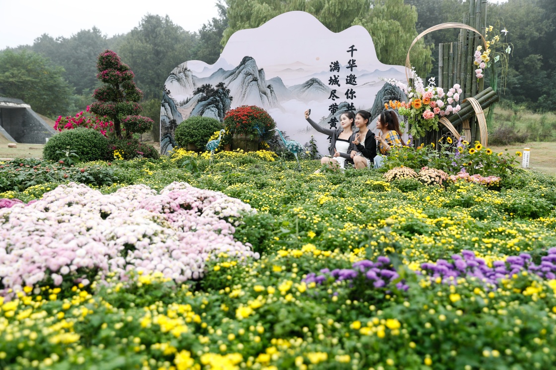 9月27日,游客在寶華山國家森林公園菊花主題景觀處自拍。