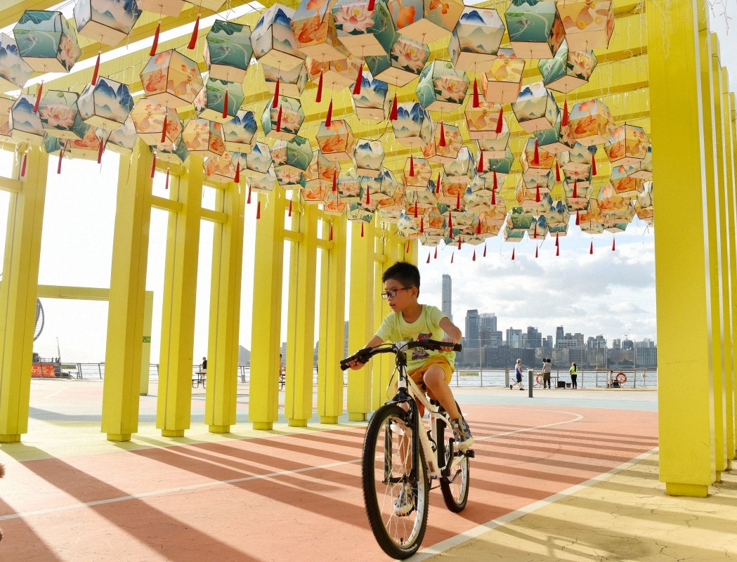 9月27日,在香港東岸公園,一名男孩騎車從中秋彩燈下經(jīng)過。新華社記者 陳鐸 攝