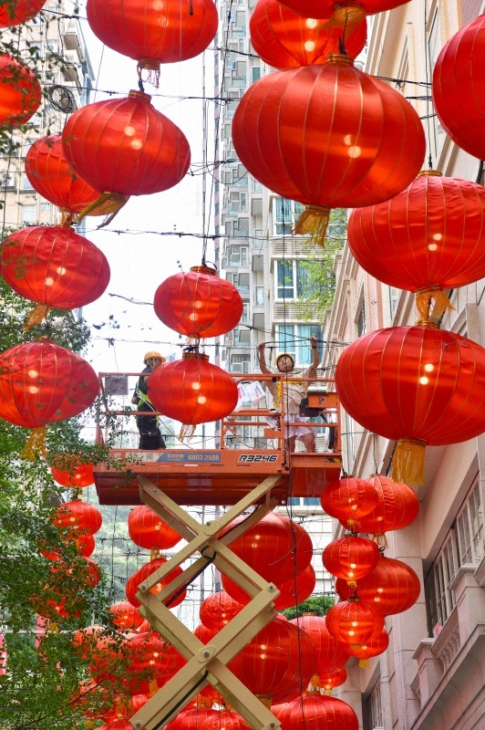 9月28日,工作人員在香港利東街懸掛大紅燈籠。新華社記者 陳鐸 攝
