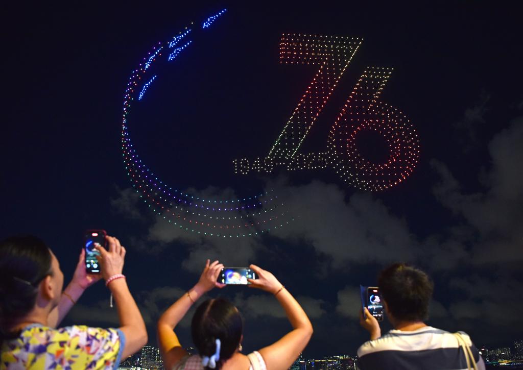 10月2日,香港舉行大型無(wú)人機(jī)匯演,慶祝中華人民共和國(guó)成立76周年。新華社記者 陳鐸 攝