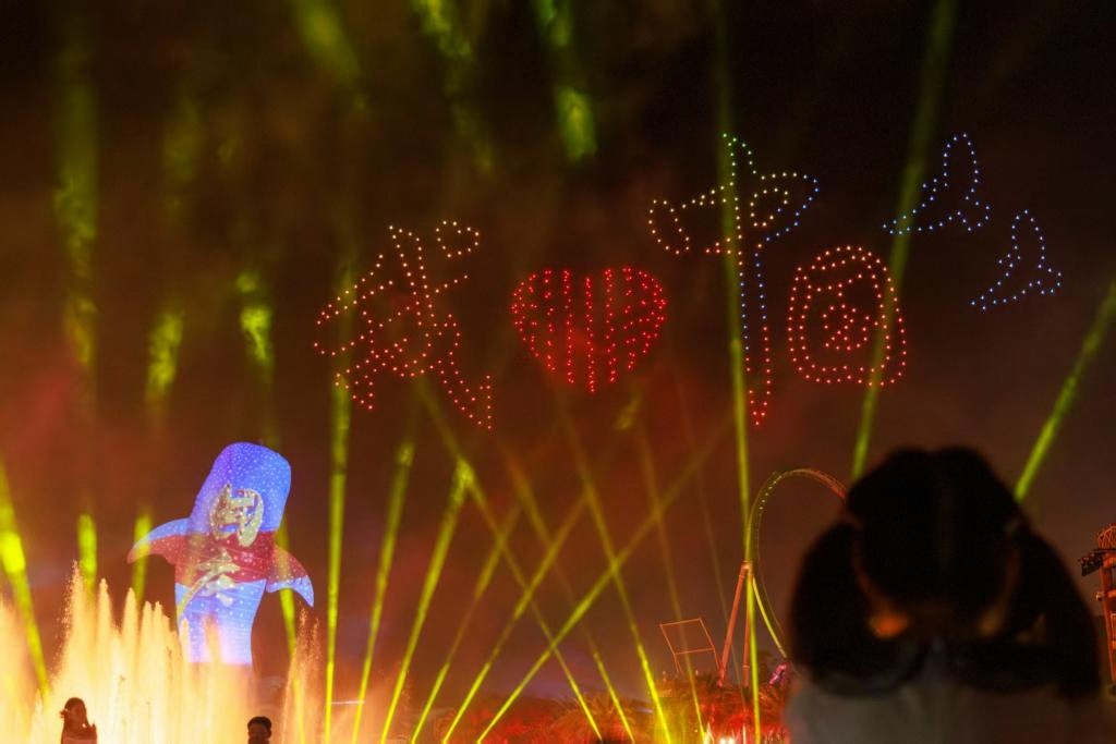 廣東珠海長隆海洋王國推出特色光影秀,為游客獻上了視覺盛宴——超600臺無人機的編隊變幻出企鵝、鯨鯊等珍稀海洋動物,結(jié)合絢爛的燈光投影以及紅色主題的節(jié)目編創(chuàng),再加上珠??萍肌疤禺a(chǎn)”無人船,360度環(huán)繞煙花效果……