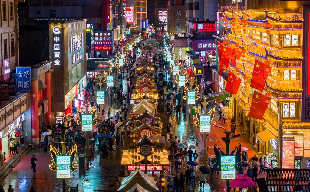 10月5日,游客在寧夏銀川市鼓樓步行街游玩(無人機(jī)照片)。新華社記者 楊植森 攝