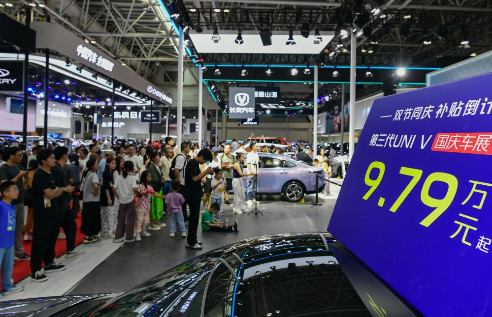 10月1日,市民在2025第46屆中國(guó)(福州)國(guó)際汽車博覽會(huì)現(xiàn)場(chǎng)觀看車商的促銷活動(dòng)。新華社記者 魏培全 攝