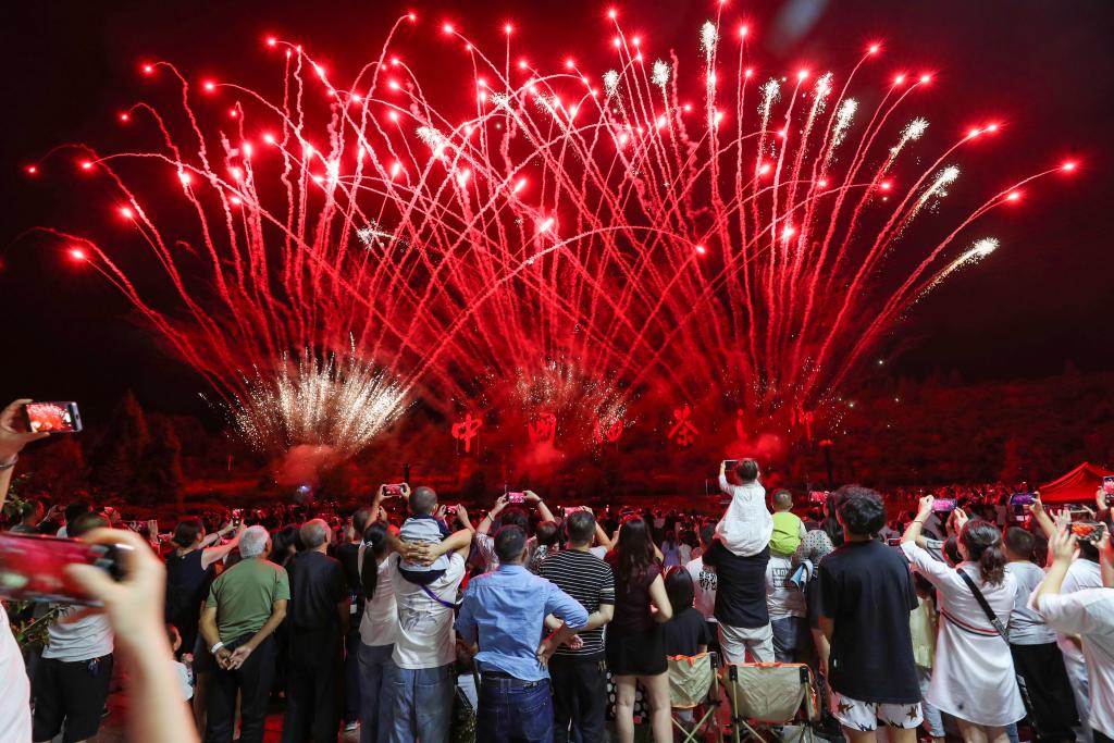 10月3日晚,游客在貴州省銅仁市玉屏侗族自治縣茶花泉景區(qū)觀看煙花。新華社發(fā)(胡攀學(xué) 攝)