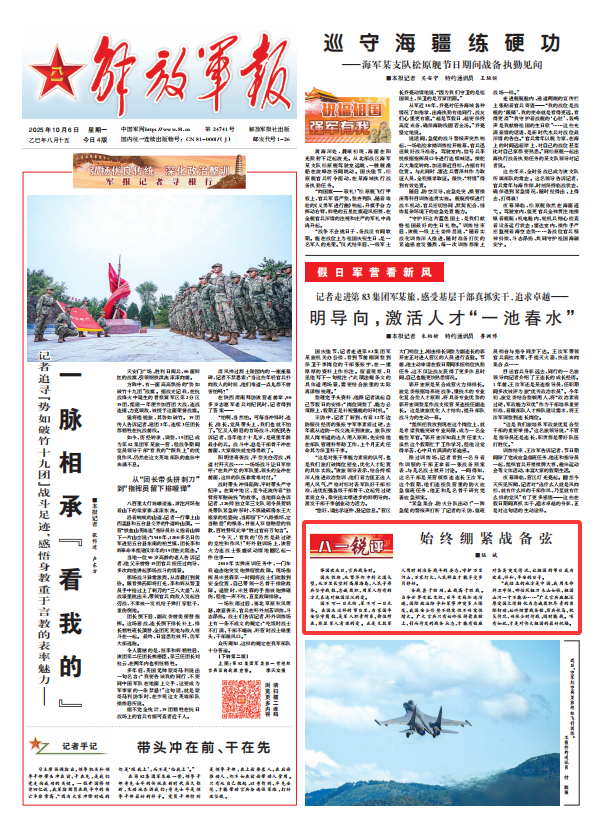 “我站立的地方是中國,我用生命捍衛(wèi)守候,哪怕風似刀來山如鐵,祖國山河一寸不能丟……”廣大官兵應把深厚愛國之情轉(zhuǎn)化為忠誠履職盡責的實際行動,始終繃緊戰(zhàn)備弦,厲兵秣馬、枕戈待旦,確保全時待戰(zhàn)、隨時能戰(zhàn)。唯有如此,才是對偉大祖國的最好祝福。