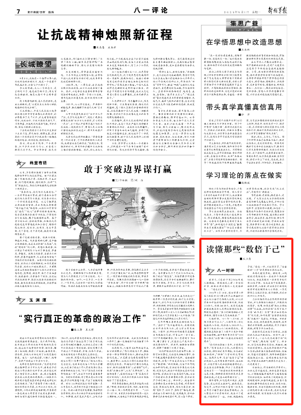 “我們必須奉獻(xiàn)于生命,才能獲得生命。”我軍自成立以來,入伍誓詞幾經(jīng)修改,但變的是文字內(nèi)容,不變的是鐵血精神,“犧牲”二字始終沒有改動(dòng)??箲?zhàn)烽火中,直面“數(shù)倍于己”的兇殘敵人,我軍將士橫刀敵陣、瀝血孤營(yíng),以超乎常人的血性膽魄看待死亡,甚至主動(dòng)選擇犧牲,印證了克勞塞維茨的名言——“物質(zhì)的原因和結(jié)果不過是刀柄,精神的原因和結(jié)果才是貴重的金屬,才是真正的鋒利刀刃”。