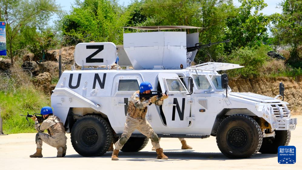陸軍某旅“劉老莊連”遠(yuǎn)赴南蘇丹執(zhí)行國際維和任務(wù),官兵進(jìn)行班組戰(zhàn)斗動作課目訓(xùn)練(2023年5月20日攝)。新華社發(fā)(任郭洋 攝)