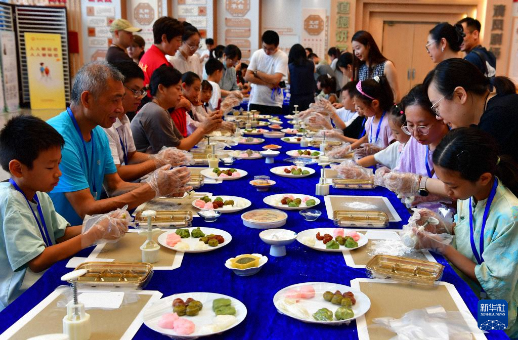 10月6日,在江蘇省江陰市新時(shí)代文明實(shí)踐中心,小朋友和家長一起制作月餅。新華社發(fā)(還月亮攝)