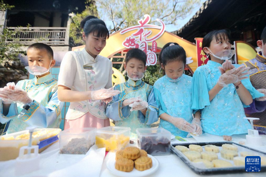 10月6日,在江蘇省揚(yáng)州市何園景區(qū),小朋友們?cè)诠ぷ魅藛T的指導(dǎo)下體驗(yàn)制作月餅。新華社發(fā)(孟德龍攝)