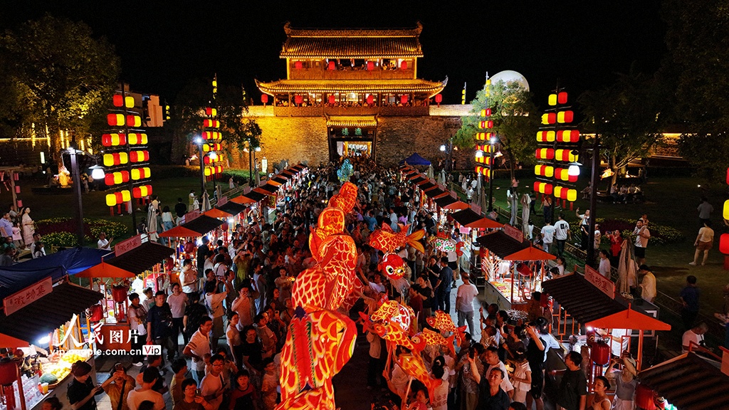 10月6日,游客在安徽歙縣徽州古城觀賞非遺魚燈巡游表演,歡度中秋佳節(jié)。汪建林攝(人民圖片網)