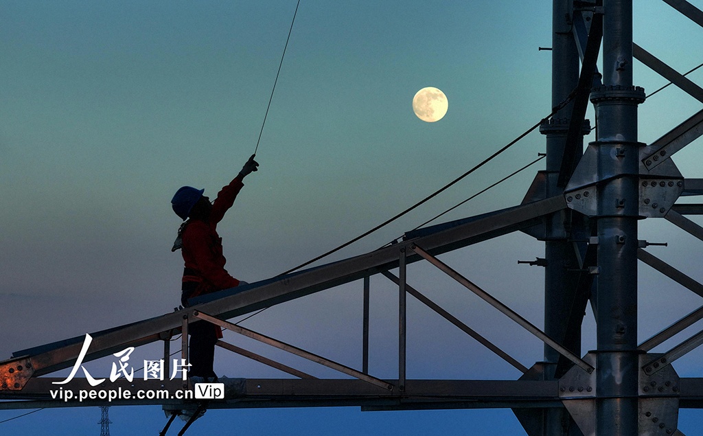 10月6日,在湖南省衡陽市雁峰區(qū)南三環(huán)路上,施工人員在高塔進行架線施工作業(yè)時與圓月同框。曹正平攝(人民圖片網)