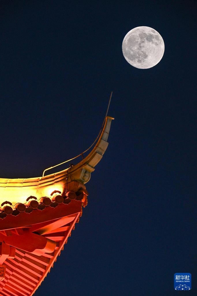10月6日,一輪圓月與江蘇省揚(yáng)州市文昌閣相映成趣。新華社發(fā)(孟德龍 攝)