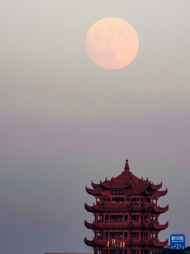 10月6日在湖北武漢黃鶴樓拍攝的月亮。新華社發(fā)(周?chē)?guó)強(qiáng)攝)