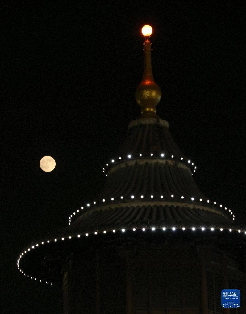 10月6日,一輪圓月與江蘇省揚(yáng)州市文昌閣的燈光相映成趣。新華社發(fā)(孟德龍 攝)
