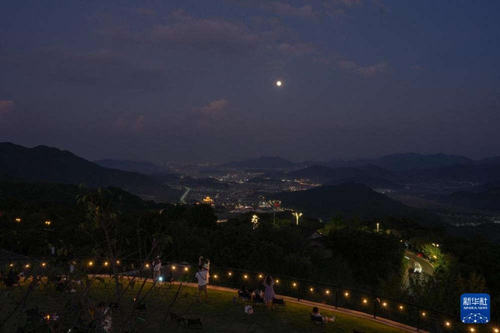 10月6日,游客在浙江省寧波市奉化區(qū)溪口鎮(zhèn)東山村一處觀景平臺(tái)賞月。新華社記者 黃宗治 攝
