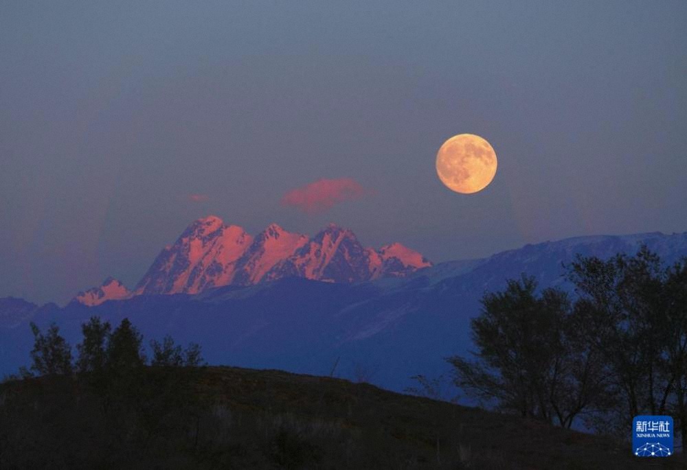 10月6日在新疆烏魯木齊拍攝的天山山脈上空的中秋圓月。新華社記者 徐宏巖 攝