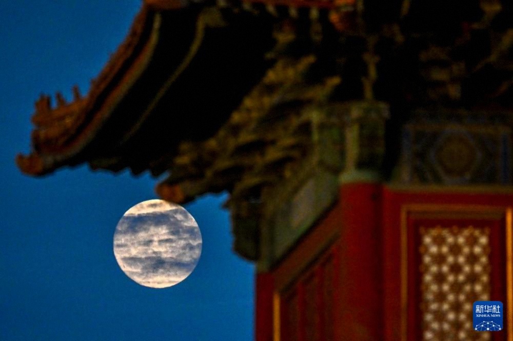 這是10月6日在北京故宮角樓附近拍攝的月亮。新華社記者 劉金海 攝