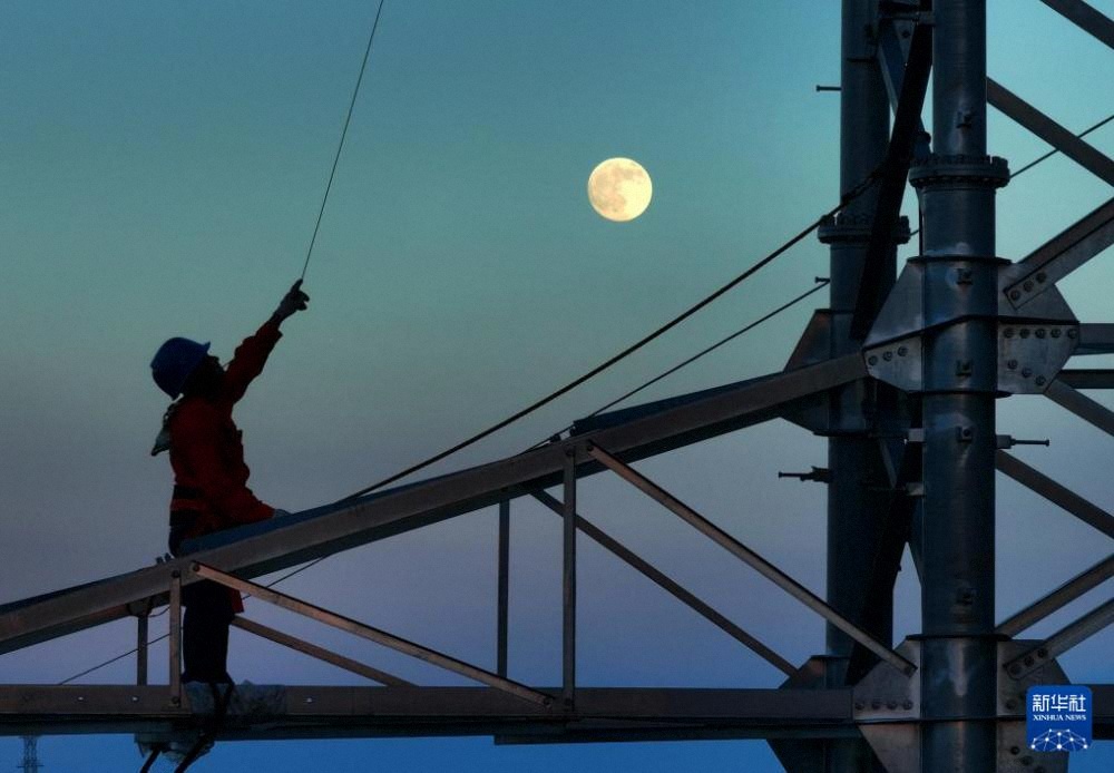 10月6日,在湖南省衡陽(yáng)市雁峰區(qū),高塔架線工人在月光的映射下施工(無(wú)人機(jī)照片)。新華社發(fā)(曹正平攝)