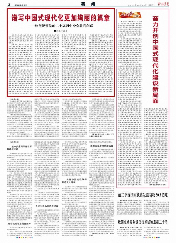 金秋時(shí)節(jié),在舉國(guó)關(guān)注和世人矚目中,中國(guó)共產(chǎn)黨第二十屆中央委員會(huì)第四次全體會(huì)議勝利閉幕。這是在向第二個(gè)百年奮斗目標(biāo)進(jìn)軍的新征程上舉行的一次十分重要的會(huì)議,對(duì)于堅(jiān)持馬克思列寧主義、毛澤東思想、鄧小平理論、“三個(gè)代表”重要思想、科學(xué)發(fā)展觀,全面貫徹習(xí)近平新時(shí)代中國(guó)特色社會(huì)主義思想,深入貫徹黨的二十大和二十屆歷次全會(huì)精神,凝聚起全黨全軍全國(guó)各族人民磅礴力量,為基本實(shí)現(xiàn)社會(huì)主義現(xiàn)代化而共同奮斗,具有重大意義。