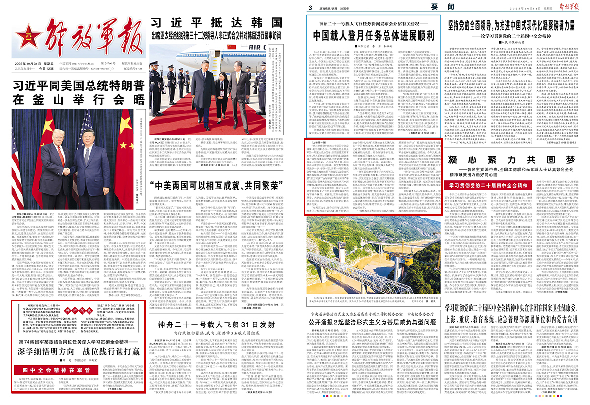 宏圖凌云志,勇毅啟新程。即日起,解放軍報(bào)推出“四中全會(huì)精神在軍營(yíng)”專(zhuān)欄,刊發(fā)各部隊(duì)深入學(xué)習(xí)貫徹黨的二十屆四中全會(huì)精神的好經(jīng)驗(yàn)、好做法,展示廣大官兵為如期實(shí)現(xiàn)建軍一百年奮斗目標(biāo)不懈奮斗的新風(fēng)采。