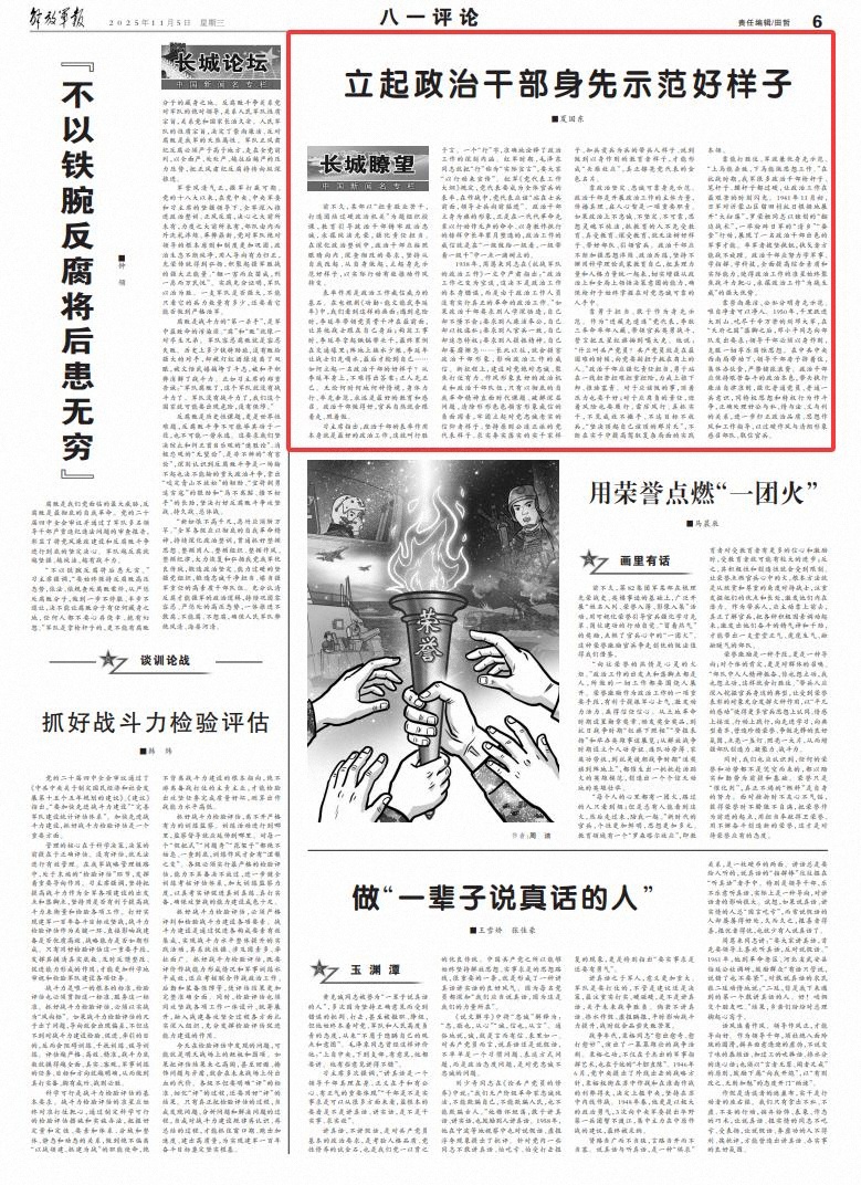 1938年,周恩來同志在《抗戰(zhàn)軍隊(duì)的政治工作》一文中嚴(yán)肅指出:“政治工作之變?yōu)榭照?,這決不是政治工作的本身錯(cuò)誤,而是由于政治工作人員沒有實(shí)行真正的革命的政治工作?!比绻胃刹恳髣e人學(xué)深悟透,自己卻不懂不會(huì);要求別人廉潔奉公,自己卻以權(quán)謀私;要求別人官兵一致,自己卻迷戀特權(quán);要求別人提振精神,自己卻萎靡懈怠……長此以往,就會(huì)損害政治干部形象,影響政治工作的威信。新征程上,建設(shè)對(duì)黨絕對(duì)忠誠、聚焦打仗有力、作風(fēng)形象良好的政治機(jī)關(guān)和政治干部隊(duì)伍,只有以徹底的自我革命精神直面時(shí)代課題、破解深層問題,清除形形色色損害形象威信的負(fù)面因素,牢固立起對(duì)黨忠誠老實(shí)的信仰者樣子、堅(jiān)持原則公道正派的黨代表樣子、求實(shí)務(wù)實(shí)落實(shí)的實(shí)干家樣子、知兵愛兵為兵的帶兵人樣子、說到做到以身作則的教育者樣子,才能形成“頭雁效應(yīng)”,真正擦亮黨代表的金色名片。