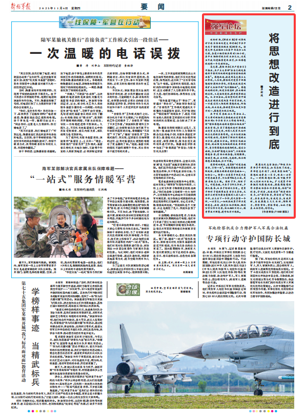 在中央軍委政治工作會(huì)議上,習(xí)主席對(duì)新征程上推進(jìn)政治建軍需要抓好的6個(gè)方面重點(diǎn)工作進(jìn)行部署,將“增強(qiáng)思想改造的自覺(jué)性和徹底性”放在首位,凸顯了思想改造對(duì)推動(dòng)政治建軍走深走實(shí)、確保人民軍隊(duì)始終純潔光榮的重要作用。這不僅精準(zhǔn)把脈問(wèn)題癥結(jié),更指明了解決問(wèn)題的正確方向、遵循和方法。持續(xù)深化政治整訓(xùn),就必須發(fā)揚(yáng)徹底的自我革命精神,著力將思想改造進(jìn)行到底,通過(guò)全面的、堅(jiān)決的“思想大掃除”,不斷剔除思想雜質(zhì)、清除私欲雜念,深挖根源、觸動(dòng)靈魂,讓正確的、先進(jìn)的、純潔的思想占據(jù)高地、堅(jiān)不可摧。