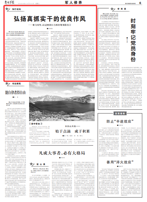 真抓實(shí)干,要錘煉“抓鐵有痕”的真本領(lǐng)和硬功夫。繩短不能汲深井,淺水難以負(fù)大舟。弘揚(yáng)真抓實(shí)干的優(yōu)良作風(fēng),不僅要提高認(rèn)識站位,更新思路理念,還要有與之匹配的過硬本領(lǐng)。能力不足想抓不會抓,素質(zhì)不高有勁使不上,謀劃工作理不清思路,推進(jìn)落實(shí)抓不住要害,就難以做到真抓實(shí)干。黨員干部唯有勤于學(xué)習(xí)、勇于實(shí)踐、善于總結(jié),才能練就履職擔(dān)當(dāng)?shù)摹皩捈绨颉保懺旃?jiān)克難的“硬脊梁”,抓落實(shí)才會有力度,各項(xiàng)建設(shè)才會有成效。從實(shí)踐看,首先要提高旗幟鮮明講政治的能力,堅(jiān)持用理論武裝醒腦提神,以政治整訓(xùn)強(qiáng)筋壯骨,做到“打鐵必須自身硬”。關(guān)鍵要提高戰(zhàn)略思維能力,善于觀察國際風(fēng)云變幻,及時掌握國際軍事動態(tài),從戰(zhàn)略和全局的高度思考問題、謀劃工作,確保始終在大局下行動。重點(diǎn)要提高應(yīng)對復(fù)雜局面的能力。黨員干部應(yīng)具備應(yīng)對各種突發(fā)事件的本領(lǐng),敢于斗爭,善于斗爭,及時化解各種矛盾和沖突,牢牢把握斗爭的主動權(quán)。同時,還要有領(lǐng)導(dǎo)部隊(duì)現(xiàn)代化建設(shè)和駕馭打贏高端戰(zhàn)爭的能力,掌握新形勢下治軍的特點(diǎn)和規(guī)律,掌握現(xiàn)代戰(zhàn)爭制勝機(jī)理,按照“三個過硬”的要求全面加強(qiáng)部隊(duì)建設(shè),提高部隊(duì)?wèi)?zhàn)斗力。以這些素質(zhì)本領(lǐng)為依托,以釘釘子精神一步一個腳印向前走,干一件是一件、抓一件成一件,確保事事有著落、件件有回音、樁樁都辦實(shí),不斷積小勝為大勝。