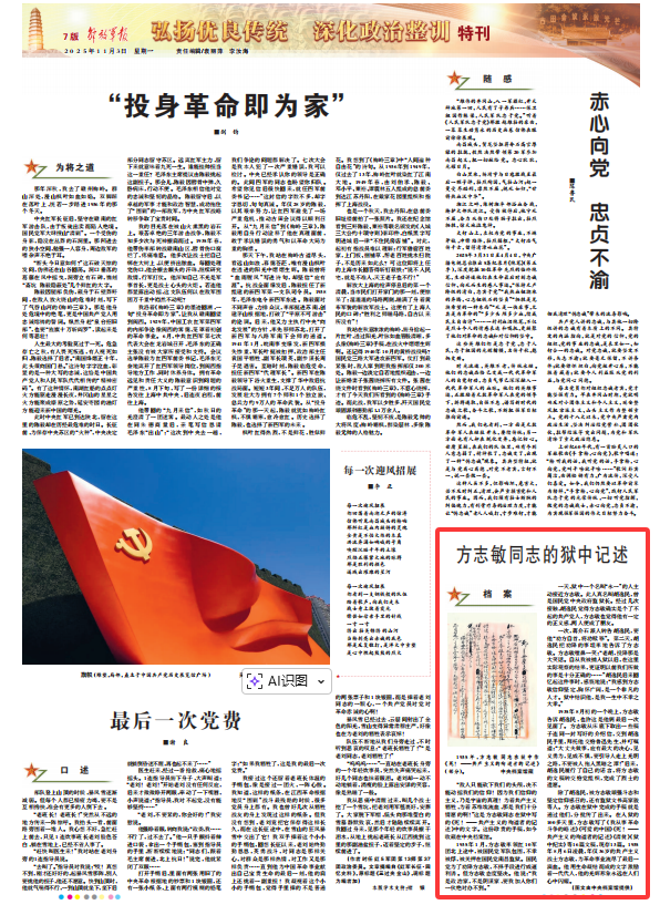 除了胡逸民,被方志敏頑強(qiáng)斗志和堅(jiān)定信仰感召的,還有監(jiān)獄文書高家駿等人。方志敏在獄中完成的手稿就是通過他們,分批傳了出來。在入獄的100多天里,方志敏寫了《我從事革命斗爭的略述》《可愛的中國》《死!——共產(chǎn)主義的殉道者的記述》《清貧》《獄中紀(jì)實(shí)》等16篇文稿,現(xiàn)存13篇。1935年8月6日凌晨,年僅36歲的共產(chǎn)主義戰(zhàn)士方志敏,為革命事業(yè)流盡了最后一滴血。他用生命凝結(jié)而成的文字激勵(lì)著一代代人,他的光輝形象永遠(yuǎn)在人們心中閃耀。