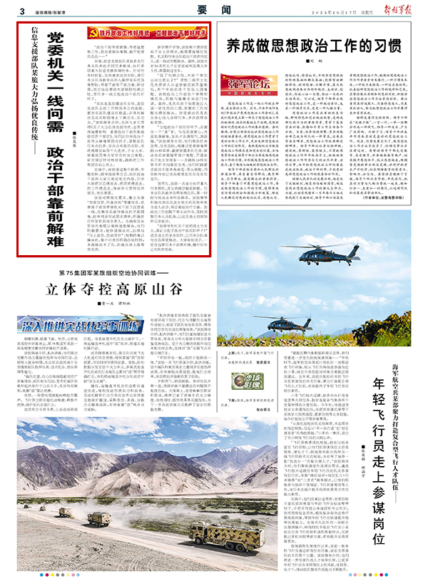 “立起政治干部的好樣子,關(guān)鍵在一個(gè)‘真’字。與官兵真貼心,為基層真解難,官兵才會(huì)真服氣、真跟隨。”該旅領(lǐng)導(dǎo)介紹,他們聚焦任務(wù)急需、官兵急盼,梳理出黨委解難幫困10件實(shí)事:翻新家屬來(lái)隊(duì)住房、解決官兵家屬隨軍落戶(hù)難題、開(kāi)通官兵子女上學(xué)班車(chē)……為確保10件實(shí)事不折不扣落到實(shí)處,他們明確要求政治干部率先垂范、帶頭領(lǐng)題,用實(shí)際行動(dòng)讓官兵感受到實(shí)實(shí)在在的變化。