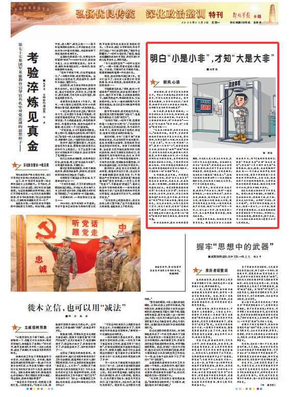 “巴豆雖小壞腸胃,酒杯不深淹死人?!痹挷诶聿徊凇,F(xiàn)實中,官兵時常面臨的考驗往往不是立場方向、黨性原則、信仰信念等大問題,而正是這些“小是小非”。何況一些所謂的“小事”,其實一點都不“小”,就拿有些段子來說,它們打著“幽默”“調(diào)侃”的旗號,實則夾雜抹黑丑化、暗箭傷人的負能量,雖然不是政治謠言,可一旦牽扯到部隊這個特殊集體,關(guān)乎的同樣是思想和意識的大問題。只有經(jīng)常進行政治體檢,不斷對思想進行提純和凈化,增強思想改造的自覺性和徹底性,才能清除一切“亞健康”因素。